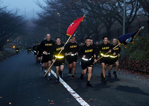 Trái: Cảnh chạy bộ với binh sĩ của TT. Việt tại Zama. Phải: Một cảnh chạy bộ tại Camp Fort Campbells khi ông còn là Đại tá chỉ huy trưởng Lữ Đoàn Nhảy dù thuộc Sư đoàn Lục quân 101. (Hình trái của USARJ Public Affairs. Hình phải của Nancy Bùi)